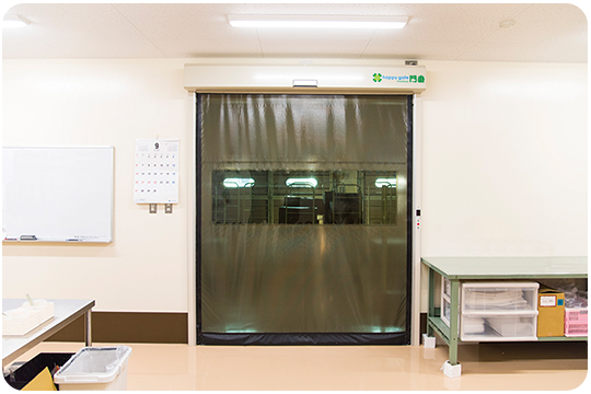 いまでも他工場では、ノレンもスイングドアもありますが、新工場に導入するならシートシャッターと思い、屋外と屋内を間仕切る箇所にまず検討し設置しました。