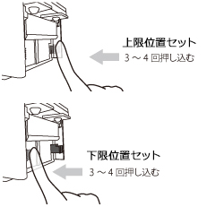 ※上下限設定がフリー状態のため、シートを巻き取り過ぎないよう停止ボタンに手をかけながら上昇・下降の操作をしてください。シャッターの動作中にセットボタンの操作は絶対にしないでください。