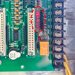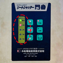 | Ⅰ型コントローラー コントローラー内の基盤上で確認 ![]() 1. 自動/手動切換スイッチ 2. 下限リミットスイッチ 3. 上限リミットスイッチ 4. 光電管センサー 5. 起動用センサー 6. 1点式押しボタンスイッチ 7. 上昇スイッチ 8. 停止スイッチ 9. 下降スイッチ |