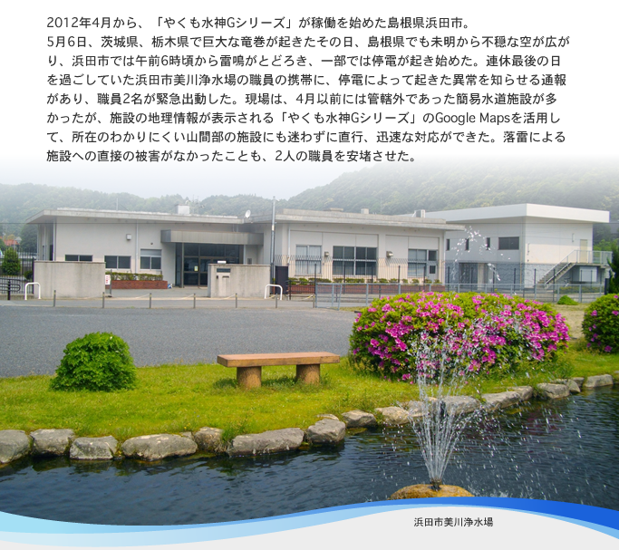 2010年、実績、技術面、提案内容など価格以外の要素を総合的に評価する「プロポーザル方式」による入札を行った結果、「やくも水神Gシリーズ」の導入を決定。2012年3月、73か所の上水道施設と、旧3町1村に該当する「自治区」の簡易水道、工業用水を合わせて182施設が完工。