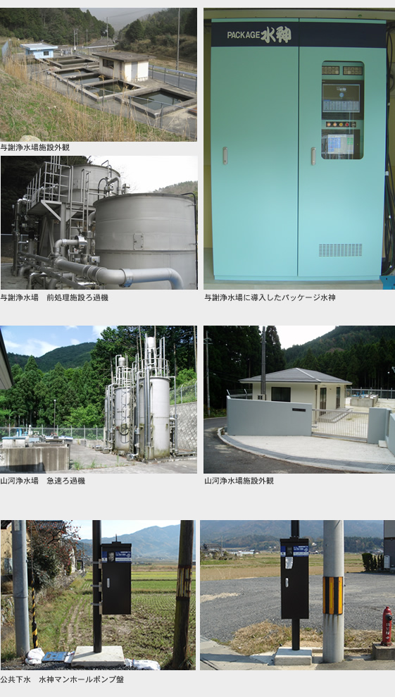 水道施設へは2003年に山河浄水場へパッケージ水神を導入し、遠隔操作・監視を有効に活用し職員の負担軽減に繋がった。