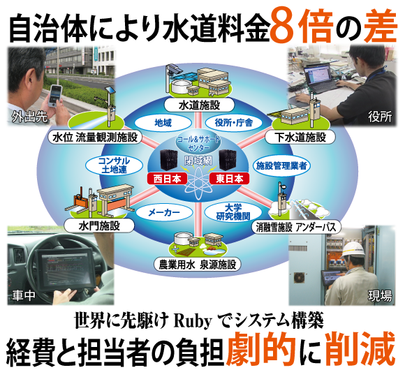 「やくも水神ネットワーク」は複数のデータセンターとLTE携帯電話網を利用した無線による通信を低コストで実現するとともに、インターネットを通じて役場と管理者が同じ情報を共有し 効率的に迅速・確実な対応を可能にします。